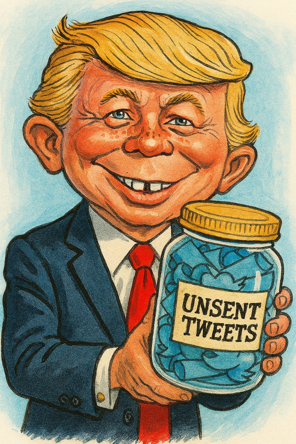 Framed and under glass, a selection of late-night tweet drafts from the @realDonaldTrump account are being sold as "modern art." Highlights include a fully capitalized draft about "Crooked Hillary's Cankles" and a near-complete thought on windmill noise causing cancer. Opening bid: $10,000 each.