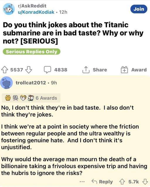The recent tragedy of the ill-fated expedition to the depths of the ocean to view the Titanic has sparked debate and controversy over the appropriateness of parodying the event. While it is understandable to feel sorrow for the explorers and their families, it is important to remember that they were well aware of the risks they were taking and chose to ignore them.